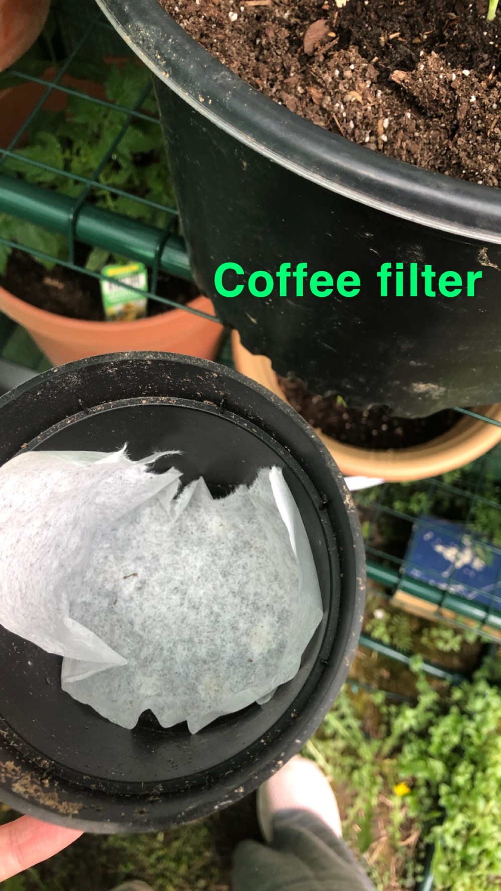 I always add a coffee filter to the bottom of my planters to keep from losing too much dirt. Since this planter is smaller I ripped the filter in half.